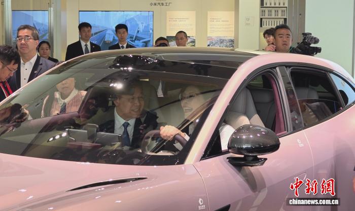 4月12日,中国国民党主席郑丽文一行,在北京参观小米汽车工厂。郑丽文(右)受邀上车体验。 中新社记者 路梅 摄