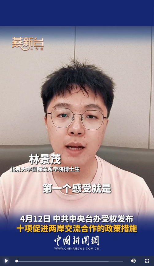 4月12日,中共中央台办受权发布十项促进两岸交流合作政策措施,其中第二条明确,建立国共两党青年双向交流机制化平台。多位在大陆求学的台湾学生在接受中新网“燕新台”工作室专访时,纷纷表达了对这项交流措施的期待。北京大学国际关系学院博士生林景茂称,看到这项政策,第一感受就是两岸青年大交流的时代要回来了。暨南大学新闻专业的林芷瑜表示,两岸青年交流走向制度化、机制化本就众望所归,更是两岸青年期盼已久的心愿。中山大学博士生吴东憬感慨道,只有亲身来大陆实地看一看,才能认清真实的发展面貌,消除刻板印象。上海交通大学媒体与传播学院硕士生陈姝妃期许,岛内青年走访过后,和身边亲友分享的不只是“我来过大陆”,更能真切感受到“在大陆找到一处值得留下来的地方”。(策划/采访:李柏涛 制作:姜雨薇)