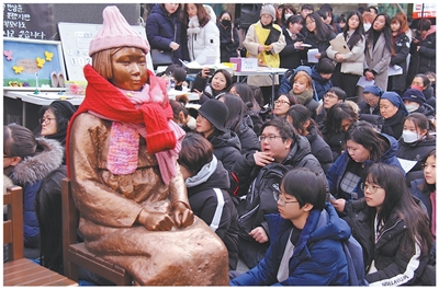 韩国民众在首都首尔一处象征日军“慰安妇”受害者的“和平少女”雕像周围举行抗议活动。本报记者 陈尚文摄