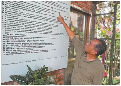马来西亚槟城战争博物馆创建者佐哈里在展板前介绍日军占领槟城后发布的“38项严令”。本报记者 白元琪摄