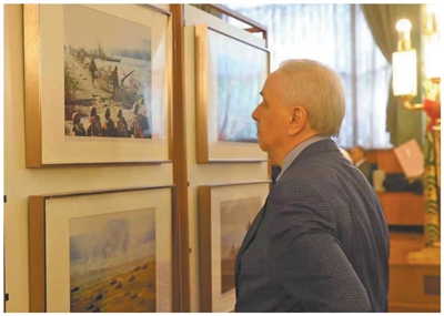 俄罗斯观众参观在俄罗斯首都莫斯科举行的“铭记历史 开创未来——纪念中国人民抗日战争暨世界反法西斯战争胜利80周年图片展”。本报记者 肖新新摄