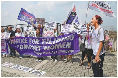 菲律宾民众在首都马尼拉一尊“慰安妇”雕像旧址附近举行二战结束80年纪念活动。泰德·阿尔希贝摄(影像中国)
