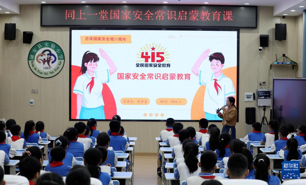 4月14日,贵州省安顺市国家保密局宣讲员在安顺市第七小学为学生讲解国家安全知识。