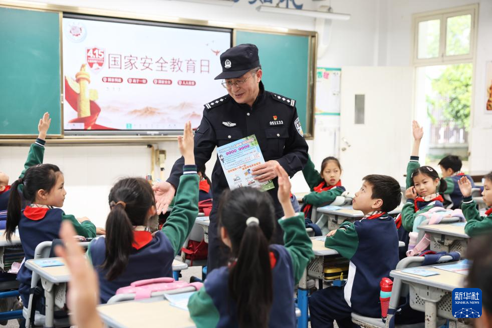 4月14日,在浙江省湖州市德清县武康英溪小学,武康派出所民警以互动方式给学生讲解国家安全知识。
