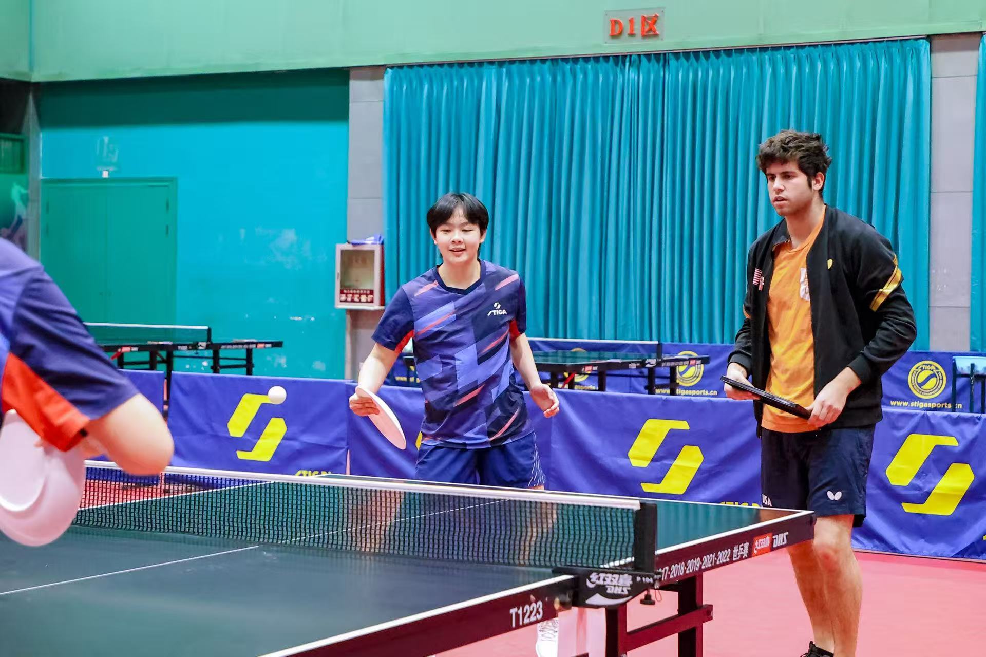 美国乒协注册运动员凯 扎雷宾在正定国家乒乓球训练基地与中国青少年球员开展友谊赛