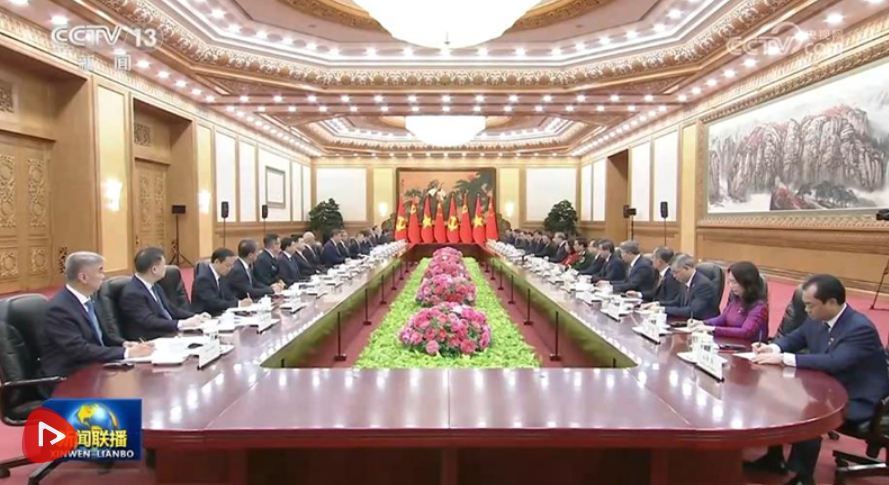 4月15日上午,中共中央总书记、国家主席习近平在人民大会堂同来华进行国事访问的越共中央总书记、国家主席苏林举行会谈。