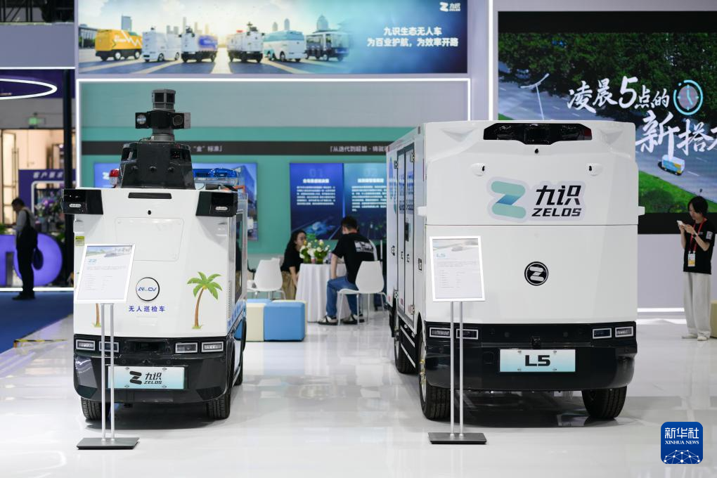 4月14日在第六届消博会科技消费展区拍摄的使用AI技术工作的九识无人车产品。