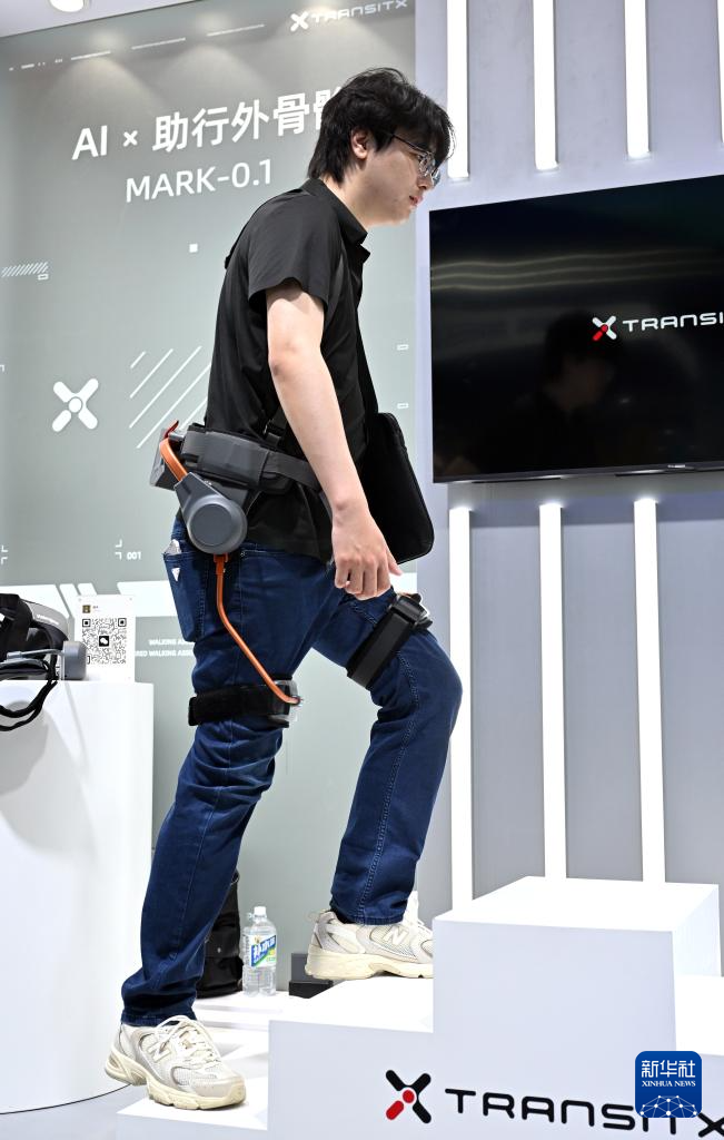 4月14日,参观者在第六届消博会现场体验一款AI助行外骨骼。