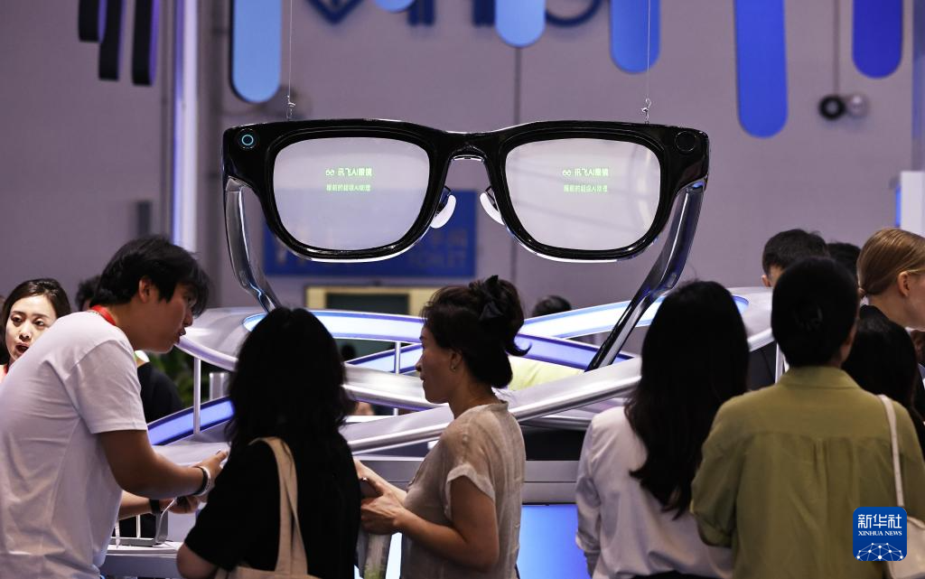 4月14日,观众在第六届消博会科技消费展区了解科大讯飞的AI眼镜产品。