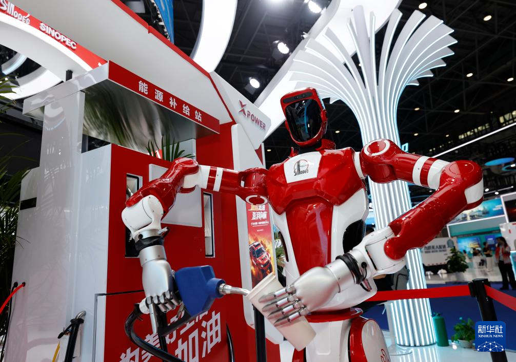 4月14日,在第六届消博会科技消费展区,中国石化展台展示机器人加油。
