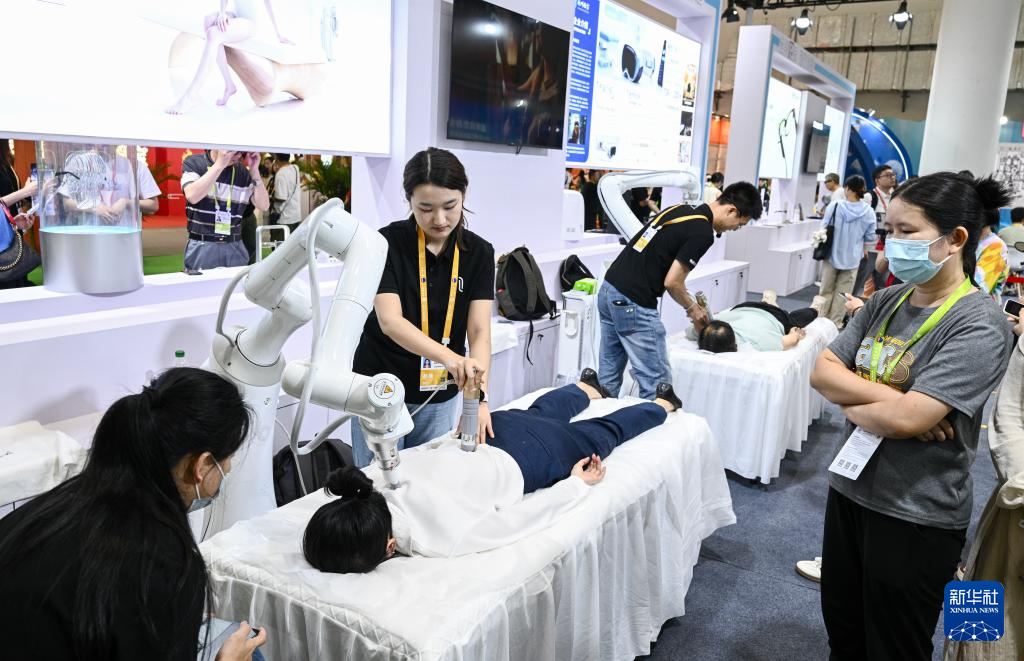 4月14日,观众在第六届消博会现场体验智能按摩机器人。