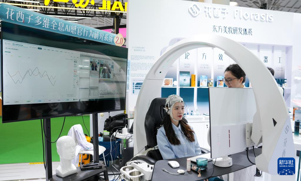 4月14日,展商在消博会现场展示美妆多维全息AI感官行为研究系统。