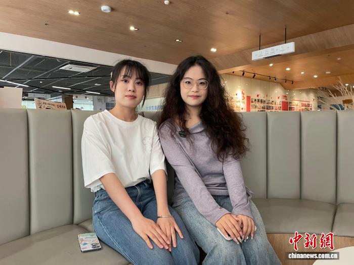 4月17日,在中南财经政法大学,台湾学生邱如莹(左)、王相平(右)讲述循着《日月潭》课文探寻日月潭及创作者故事的经历。 中新社记者 马芙蓉 摄