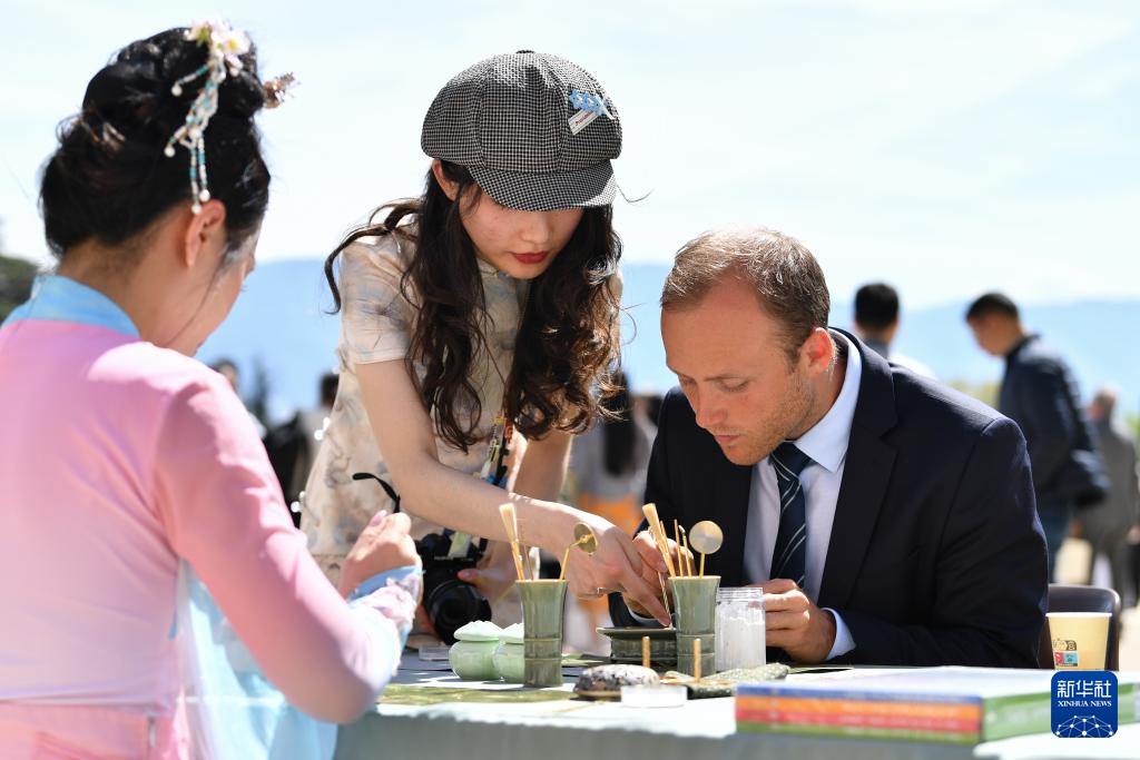 4月17日,在瑞士日内瓦万国宫,嘉宾在体验宋式篆香。