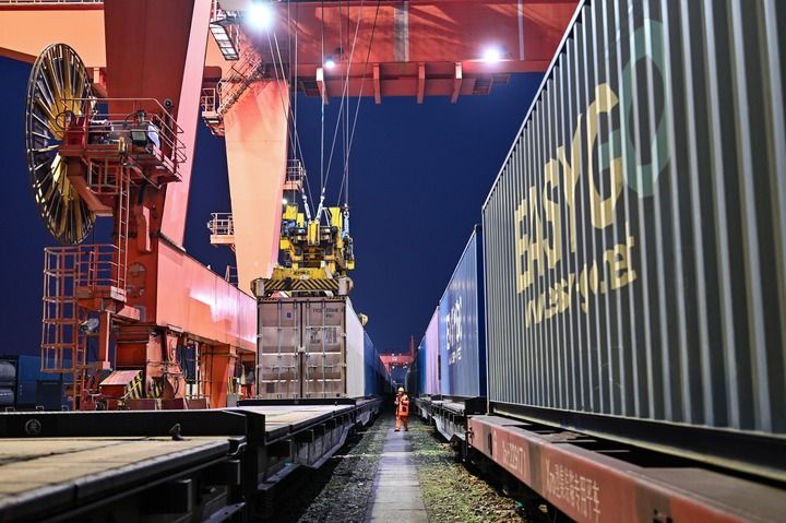 2026年2月16日,货运员在成都国际铁路港检查吊运的中欧班列集装箱。新华社发(何海洋摄)