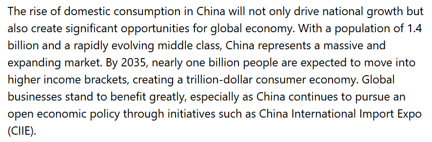 文章认为,中国消费的持续崛起,不仅将推动自身增长,也将为全球经济创造巨大机遇。凭借14亿人口和不断扩大的中等收入群体,中国正在形成一个体量庞大、持续扩容的消费市场。