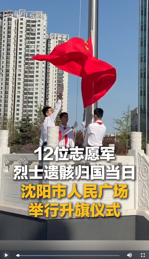 4月22日,第十三批在韩中国人民志愿军烈士遗骸归国当日,沈阳市人民广场举行升旗仪式。现场,沈阳市少先队员代表们整齐列队,与志愿军老战士代表、抗美援朝烈士家属、杨根思烈士家乡江苏泰兴和“杨根思连”驻地河南许昌这两地少先队员代表,以及港澳台学生代表、沈阳市优秀青年和大学生代表,共800余人共同向归国先烈致敬。