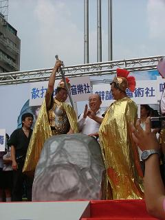 中国台湾网8月1日消息 据台媒报道,中国国民党青年团在上个星期正式选出台湾世新大学研究生黄执中,担任新任总团长,今天下午举行交接典礼。在国民党主席吴伯雄的见证下,打扮成武士的原任总团长林益世正式把总团长职务交给新任总团长黄执中。