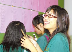 台湾大考昨天放榜,在台北“北一女中”,学妹认真寻找熟悉学姐的名字,一看到榜上有名,赶在第一时间传送简讯报喜。(台湾《中国时报》图片)