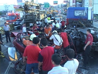 经清算,共有16部大小车辆撞成一块,其中一辆红色小客车受创最严重,遭撞击后整辆车瞬间变成一堆废铁,车内4人都被卡在车内。