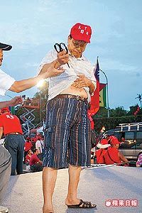 去年焚车呛扁的蔡芳树,昨天剪刀刺肚皮,抗议陈水扁害人民生活困苦。(图:台湾《苹果日报》)