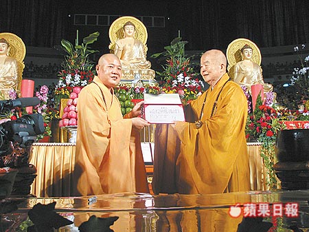 佛光山创办人星云法师(右)致赠感谢状给寒山寺住持秋爽法师。