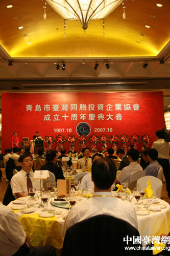 中国台湾网9月18日青岛消息 昨天晚上,青岛市台资企业协会成立十周年庆典大会在香格里拉大饭店隆重举行,国台办经济局局长徐莽,中共青岛市委常委、秘书长张泽忠,副市长马世忠,中国国民党政策会副执行长兼大陆事务部主任张荣恭,台湾工业总会、台湾工商协进会、台湾区厂商联合总会参访团成员,以及出席2007年台湾同胞投资企业协会会长座谈会代表等五百余人出席庆典。