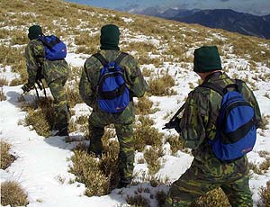 读者提供相片说,“特战训练中心”进行雪地训练时,不仅手上拿的是MP5的假枪,而且身穿迷彩服的特战官兵身后背的背包,居然也是外购的蓝色背包,根本无法做好雪地训练的伪装。负责台军特战指挥的王国强无奈地说,该名邱姓中校因为训练过于严格,有时甚至到了六亲不认的地步,遭投诉可能是因为人际关系没处理好,他绝对力挺这名教官。