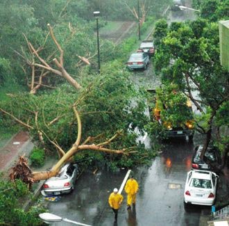 台北市东华街、西安街的捷运沿线许多路树倒塌,多辆汽机车遭压顶。