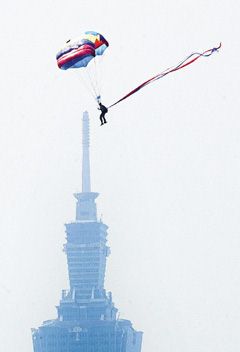 中国台湾网10月17日消息 据台湾《联合报》报道,今年台湾“双十庆典”当天天气不好,台军“神龙小组”跳伞表演未能上场。陈水扁办公室要求台军方找适合时机“再跳”,现已锁定11月3日“入联”火炬路跑一周返回台北时,让“神龙小组”在凯达格兰大道进行高空跳伞,与“入联”议题绑在一起。