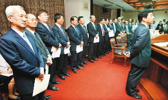 “立委”杨琼璎要求台当局“财政部”所属单位有上缴“总体施政宣传费”的业务主管站上台,20人排排站,由“财政部长”何志钦(右)领队。“立委”问知道该笔钱如何用的人请举手,只有何志钦举手,其他人都不知。《联合报》记者郑琼中 摄