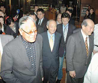 李登辉(左)昨晚宴请“独派”人士,台当局前“中选会主委”黄石城(中)也受邀,李登辉认为要解决台湾当前政治危机最优先的办法,就是“政局重组,建立本土派的第三势力”。《联合报》记者林建荣摄