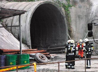 曾文水库越域引水隧道工程,4日下午疑因挖到油气矿层发生气爆,两名工人受困洞内,搜救人员带齐装备,准备入洞救人。《联合报》记者谢恩得摄