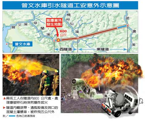 中国台湾网11月5日消息 据台湾《联合报》报道,台当局“水利署”施工中的曾文水库越域引水隧道工程,昨天下午1时以炸药爆破时,可能挖到油气矿层而发生气爆,工人刘铭文、邱仕聪受困在隧道内,今天凌晨搜救人员先后找到两人遗体,两人仅相隔5、6米。