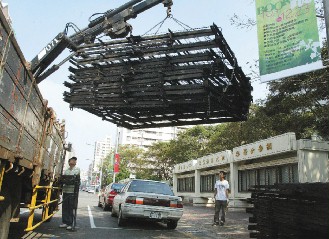 高雄市警方将“拒马”载往法院周围,准备架设。(联合晚报图)
