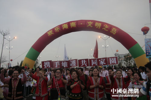 中国台湾网11月17日琼海消息 昨天下午,正在海南参加第二届两岸大学生冬令营的两岸师生,专程从三亚市赶赴琼海,参加正在隆重举行的第八届海南欢乐节开幕式及巡游活动。在这里,他们与从刚刚到达海南的台湾少数民族代表团不期而遇,成为了巡游中最受瞩目的群体。