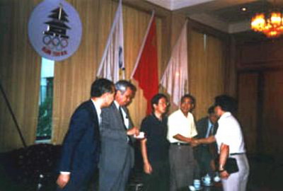 1993年谢长廷(黑色短袖衫,左三,五星红旗下)、前民进党主席姚嘉文(白发者,左二)、民进党“立委”蔡同荣等人前往大陆访问,在北京机场贵宾室内于五星红旗下合影。(《中国时报》图)