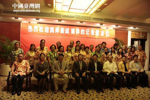 台湾记者身穿被海南人冠以“岛服”名称的海岛旅游休闲服与海南省有关领导合影