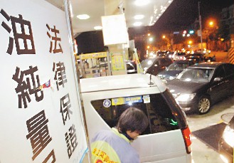 台湾传出加油站卖假油,一家加油站特意打出“法律保证、油纯量足”,让顾客安心。(联合报图)