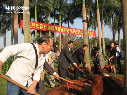 中国台湾网11月30日海口消息 昨天上午,参加“两岸媒体海南行”的40余名两岸记者共同在海口万绿园植树,表达两岸新闻界保护环境,造福后代人的美好愿望,并预祝两岸媒体的友谊像记者林一样,根深叶茂、万古长青。(李杰)