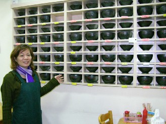 屏东面店碗墙上的每个碗都有编号,客人可以选择喜欢的号码,放在贴有自己名字及编号的架子上,就算完成认养。以后只要来用餐,老板就拿个人“专用瓷碗”装面。