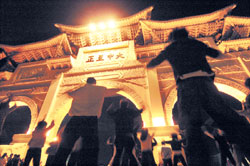 台当局“教育部”打算拆除中正纪念堂“大中至正”牌匾。台北市政府向台北高等行政法院声请假处分,要求暂缓拆除,经台北高等行政法院审理后予以驳回。但另一方面对于拆除牌匾的现行犯,台北市政府也有逮捕权力。图为学生们聚集在“大中至正”牌匾下运动。 (台湾《中国时报》图片)