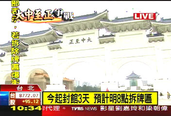 据TVBS了解,拆除牌匾的行动,很可能在明天上午8时进行拆除仪式;“大中至正”拆卸之后,会立刻挂上“自由广场”新牌匾,到时势必又会有一波冲突发生。(高大林)