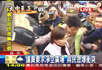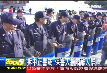 另据“TVBS”报道,从上午9时开始,为了怕民众再次发生冲突,中正纪念堂现场出现约300多名防暴警察,他们拿着盾牌围成人墙,一步步往牌楼外走,企图隔离民众。