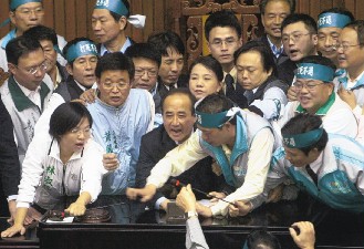 民进党瘫痪议事的招术还不只一招,上次用强力胶及大锁锁住议事主席进出的大门,这次改用议事人员的座椅全面堵住大门,不让王金平进出。据透露,民进党备妥“和平”与“暴力”两种因应版本,只要国民党要玩“硬的”,绝对奉陪到底。