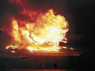 报道说,台湾高速公路警方今天凌晨零时30分左右接报,指称在三号高速公路北上304公里、接近台南县与嘉义县交界路段,发生小客车对撞起火事故。