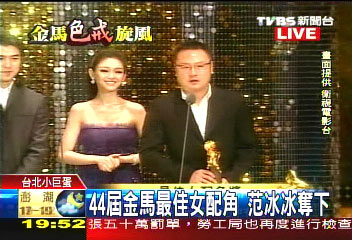 金马奖第一个奖项是最佳女配角,角逐该奖项的有张钧宁、邵美琪、范冰冰、曾恺玹;最后由出演《心中有鬼》的范冰冰夺得;但因为行程关系,范冰冰无法出席,由电影公司代表领奖。