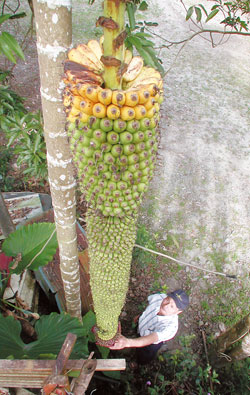 当地植物学者许再文说,这么大串,有可能让香蕉干身承受不住,3米的高度,还可能抵住地面。由于蕉果过多,栽培应格外注重施肥。