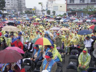 报道说,台东县昨天虽然下着间歇性大雨,但挡不住乡亲对马英九的热情,有近4000人到场,旗帜满场飞,加油、“冻蒜(当选)”声不绝于耳。马英九分别以中文、闽南话、客家话与台湾少数民族语,带动齐喊“国民党一定胜选”,声音响彻云霄。