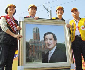 马英九(右二)昨天在嘉义县为国民党“立委”候选人翁重钧(右三)站台辅选,获赠“前进总统府”画像,右一为前任嘉义县长李雅景。(联合报图)